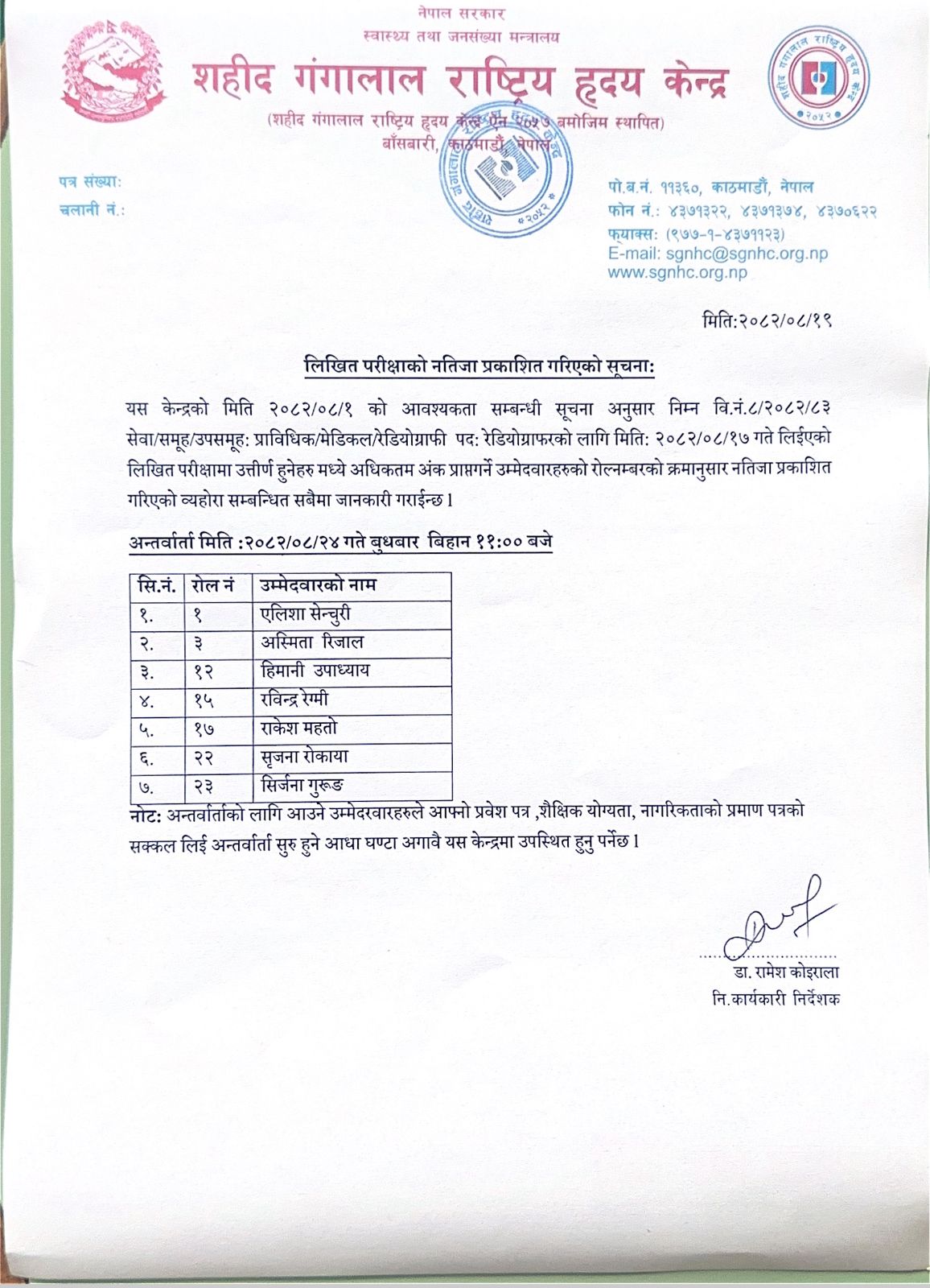 | रेजिडेन्ट चिकित्सक(पेडियाट्रिक कार्डियोलोजी)को लिखित परीक्षाको नतिजा प्रकाशन तथा अन्तर्वार्ता सम्बन्धी सूचना | 2025-03-23 | View |