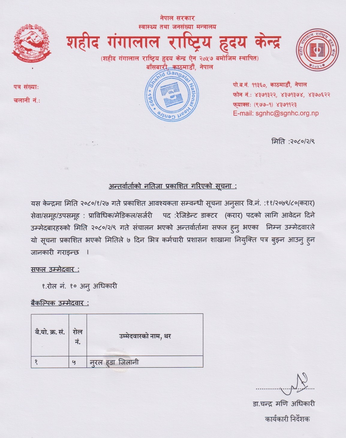 | रेजिष्ट्रार (पेडियाट्रिक कार्डियोलोजी)को नतिजा प्रकाशित गरिएको सूचना : | 2024-09-26 | View |